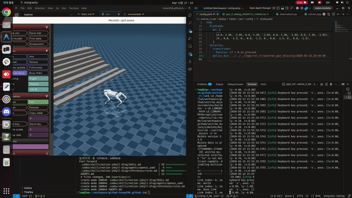 발을 들게하는 여러가지 reward를 추가하였더니 이제는 mujoco상에서는 go2가 걸을 수 있게 되었습니다.