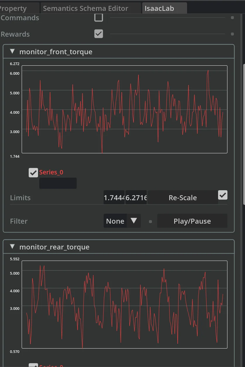 go2에 depoly된 모델의 토크값을 확인해보았을때 뒷다리의 토크값이 앞다리에 비해 비정상적으로 낮은 것을 확인하였습니다. 원인으로는 아래 두가지를 생각하고 있습니다.